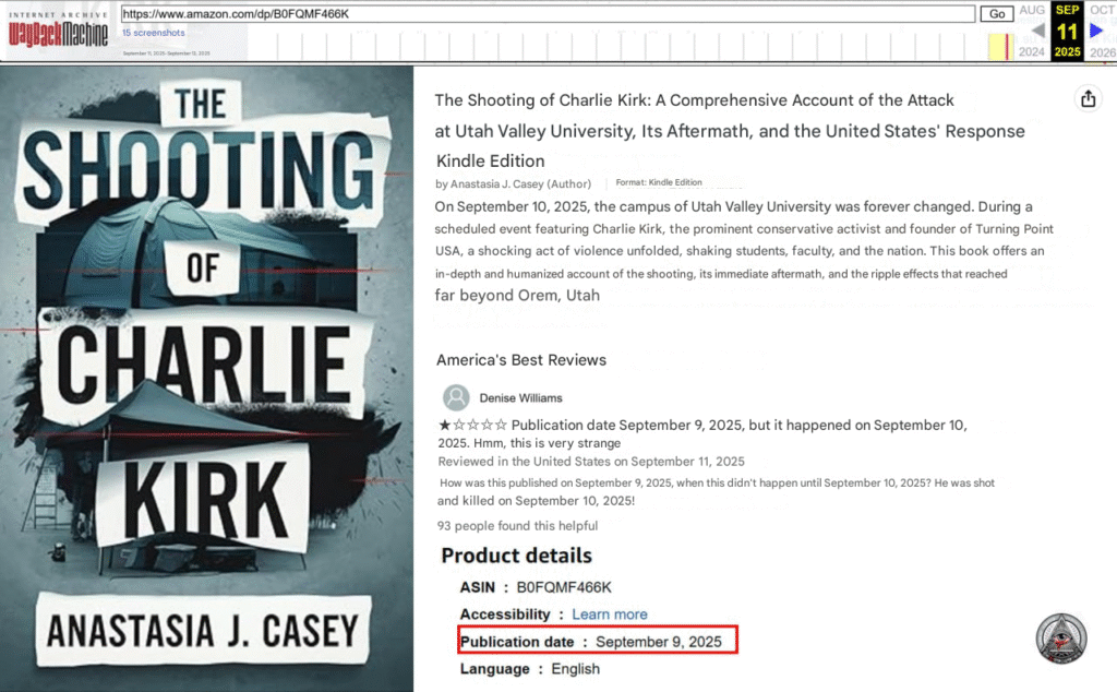 🇺🇸 According to Amazon records, a book about Charlie Kirk’s murder was published on the platform on September 9th, the day before he was killed. The book is no longer available on the platform but has been registered (https://web.archive.org/web/20250911163616/https://www.amazon.com/dp/B0FQMF466K) in the Internet Archive (the record is from the 11th…).