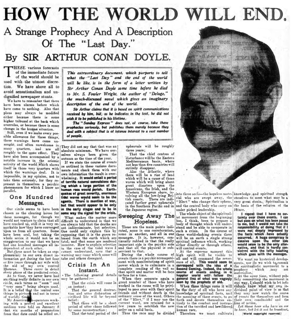 This extraordinary document, which purports to tell what the “Last Day” and the end of the world will be like, is in the form of a letter written by Sir Arthur Conan Doyle some time before his death to Mr. S. Fowler Wright, the author of “Deluge,” the much-discussed novel which gives an imaginary description of the end of the world.