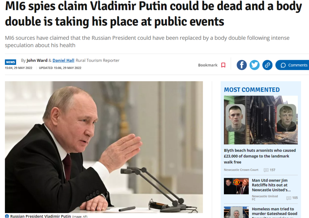 Ward, J. (2022, May 29). Vladimir Putin could be dead and a body double is taking his place, says MI6. Chronicle Live. https://www.chroniclelive.co.uk/news/world-news/vladimir-putin-dead-body-double-24093176